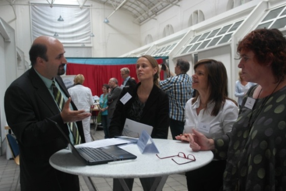 Die Workshopteilnehmenden hatten die Möglichkeit, sich kurz in Kleingruppen an den Stehtischen über die IQ Modellprojekte zu informieren und auszutauschen. Modellprojektleiter Cemalettin Özer (MOZAIK gGmbH, Bielefeld) präsentierte am Stehtisch 1 “Wege der Ansprache“ das IQ Modellprojekt „Interkulturelle Arbeitsmarktlotsen aus Migrantenorganisationen in Nordrhein-Westfalen“ .